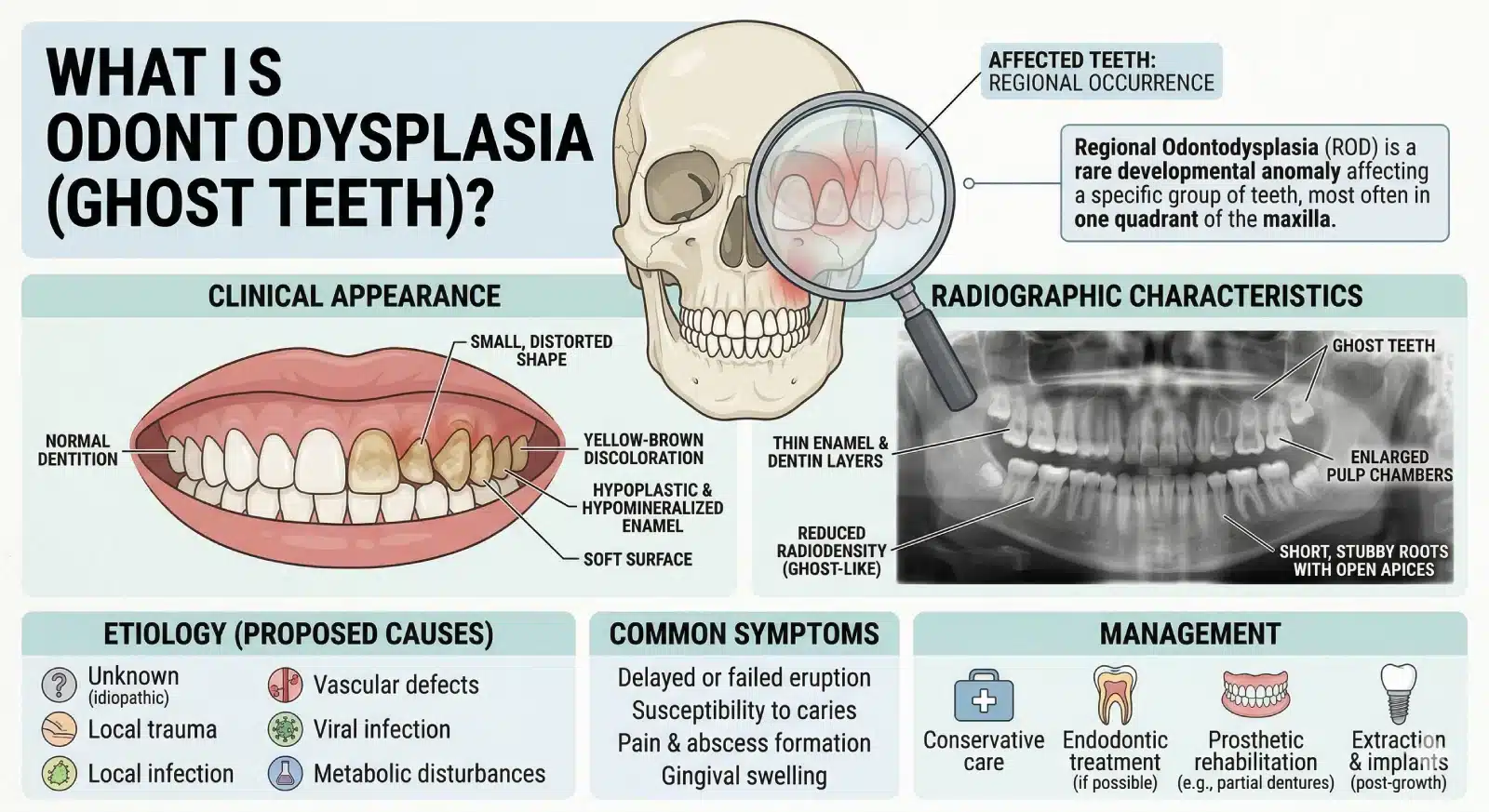 In many cases, odontodysplasia affects only a specific area of the mouth rather than all teeth. Because the teeth do not develop normally, they can be more likely to break, become infected, or fail to erupt properly. Early diagnosis and regular dental care are important to manage this condition and protect oral health.